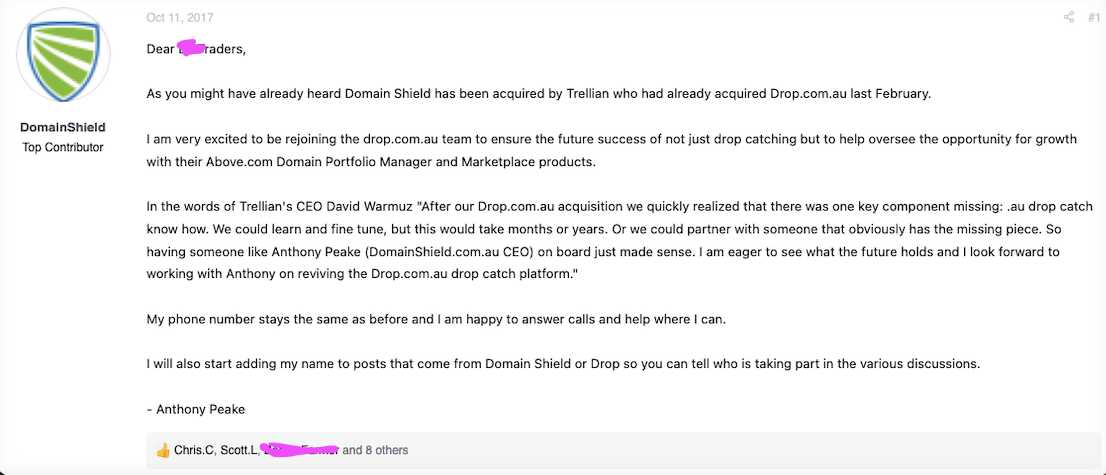 Multiple domain name industry veterans have reported to us that Anthony Peake has left Drop.com.au and no longer works with David Warmuz, owner of Drop.com.au, Above.com, Trillion.com and DomainShield.com.au(.)