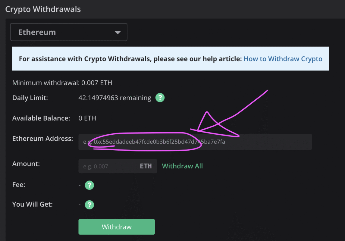 You would then INPUT this address into the CRYPTO WITHDRAWAL section, as shown in the picture above.