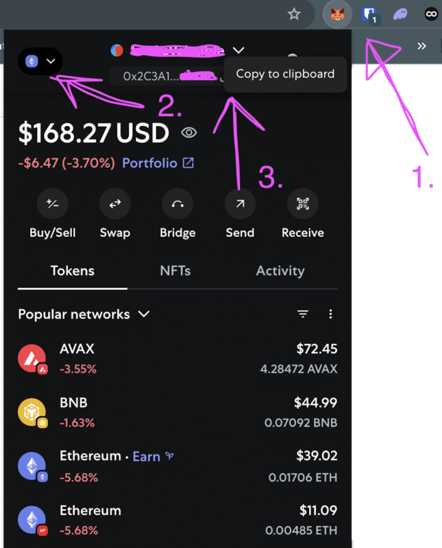 To get your MetaMask ETH Wallet Address, you would copy the ETH WALLET ADDRESS (in the below pic – Number 3)