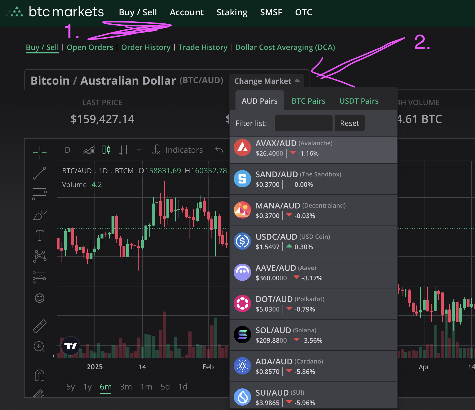 Once you’ve logged into BTC Markets, choose the BUY/SELL tab, and then CHANGE MARKET to the coin you wish to purchase.